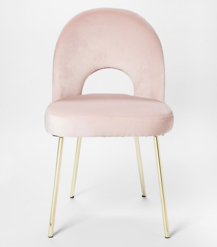 “这一本世纪中叶的现代椅子的柔和的粉红色的颜色配对的丝绒质地是需要以一个女性的流行音乐添加到任何餐厅空间或办公室时的理想选择。此外,黄金腿部增加复杂性和细化。为了得到这个项目,干脆去目标你知道这意味着什么:。实用又实惠”- 布列塔尼Zwickl