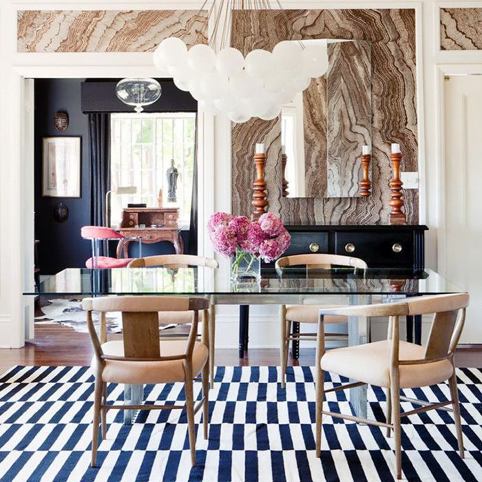 这间餐厅的玛瑙墙纸既光滑又朴实。玛瑙环的自然图案与大理石的漩涡相似,但我偏爱玛瑙更有条纹的纹理和更丰富的色调。