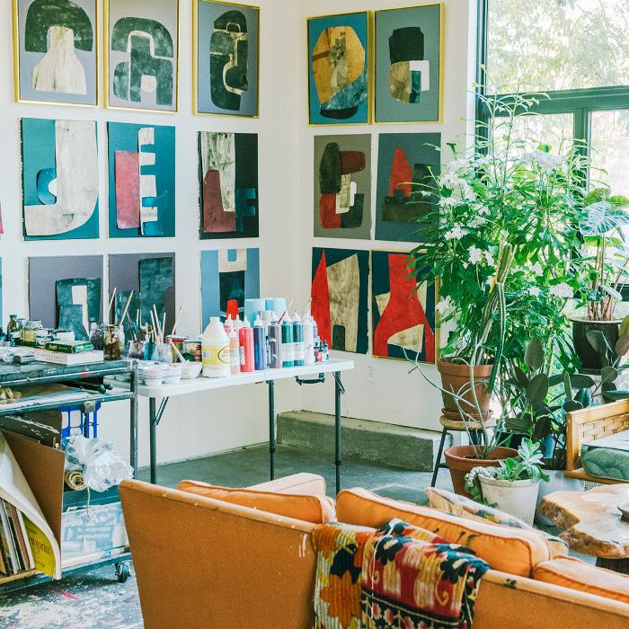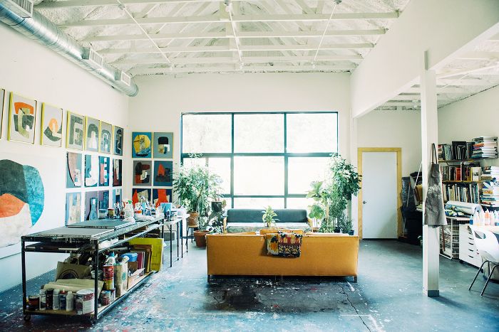 “我知道我希望空间的中心没有任何家具。所有的组织和管理工作都是围绕这个范围进行的。我想让它感觉尽可能的宽敞。我也想在地板上伸展画布,也想在地板上放几张纸来创作艺术。(基本上,我是想象的海伦FRANKENTHALER在那张著名的照片里,她坐在自己的作品上。)