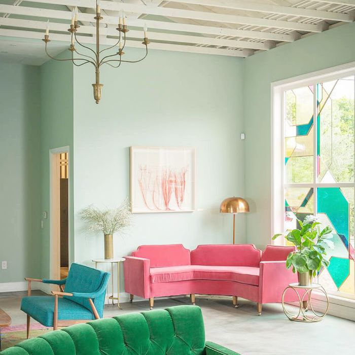 由总部位于加州的室内设计师艾米丽亨德森设计,这种空间是一个现代版装饰艺术设计的华丽表现。从柔和的色调,以玫瑰金落地灯的几何彩色玻璃,簇绒凯利绿色簇绒沙发,和热粉色的装饰艺术风格的地毯,每一个项目是从昔日的设计的现代版。