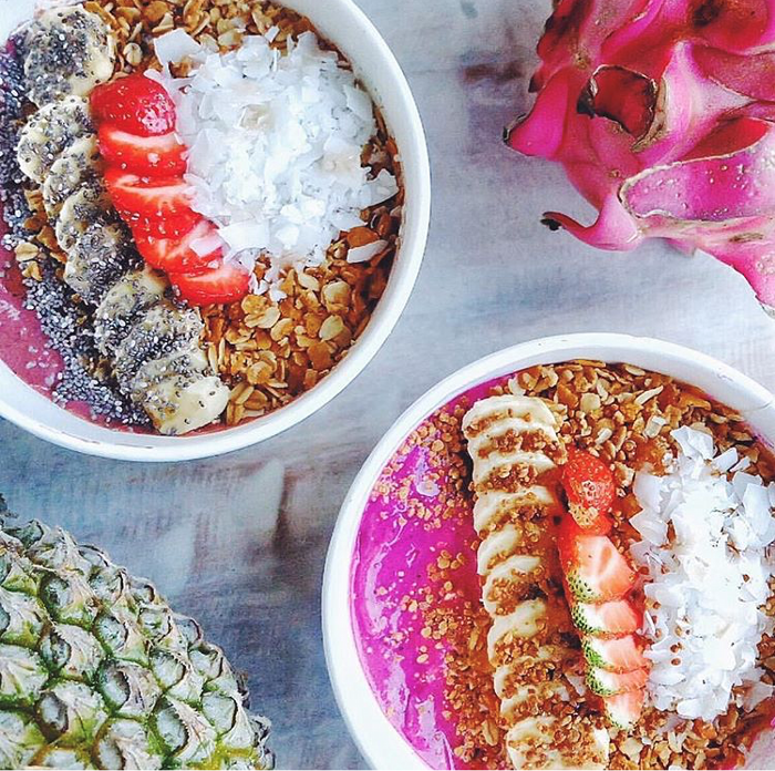 我们就说这是我们的早餐吧。娜鲁碗在巴厘岛的高温下是无与伦比的。想想你最喜欢的巴西莓碗,并添加各种水果和新鲜的浇头——它们快速,简单,完全提神。
