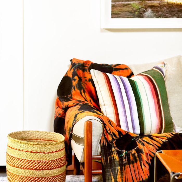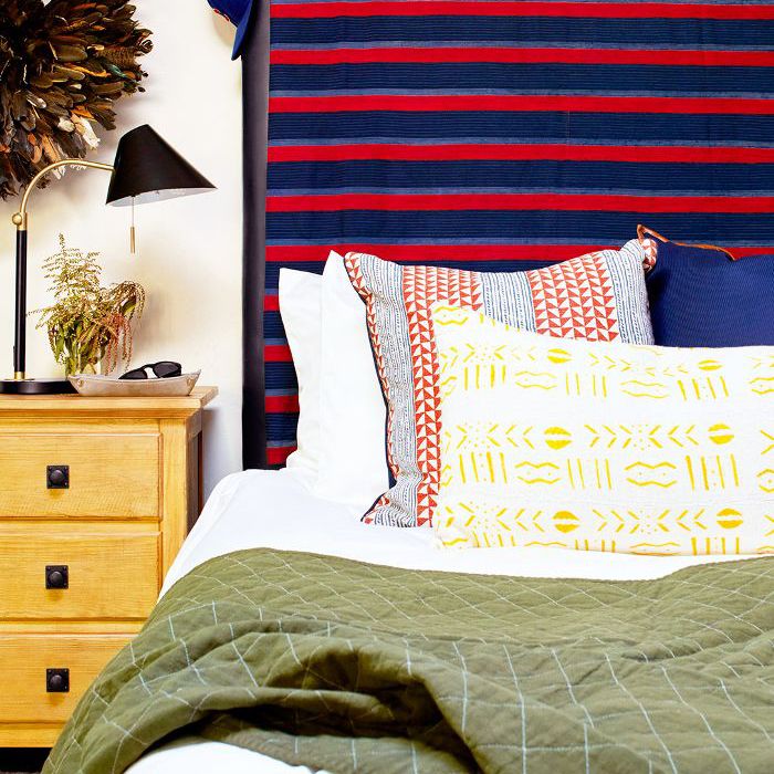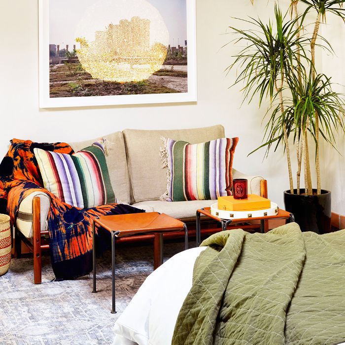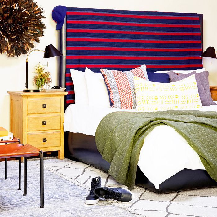 在拿下复古围裙枕头内森·特纳添加丰富多彩的氛围寝室的客厅。在床上,也弥敦道特纳拿起stiched橄榄毯增加了一些额外的阳刚魅力。