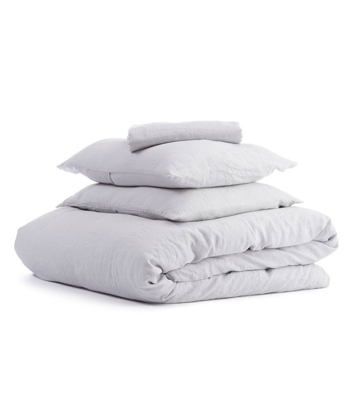 降落伞的亚麻布床单是我见过的最柔软、最舒适的。我喜欢‘雾’,它是一种浅灰色,与白色和蓝色搭配得很好,这样我就可以与我的其他服装搭配。”
