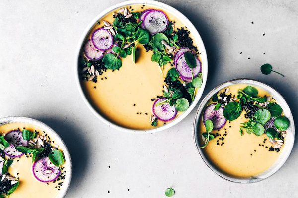 的提示:“趁热喝汤和装饰与正规和姜黄芝麻酱奶油的漩涡,”建议配方创造者的劳拉第一混乱。“如果你喜欢的话,可以用削皮刀在漩涡里削出大理石的效果。”