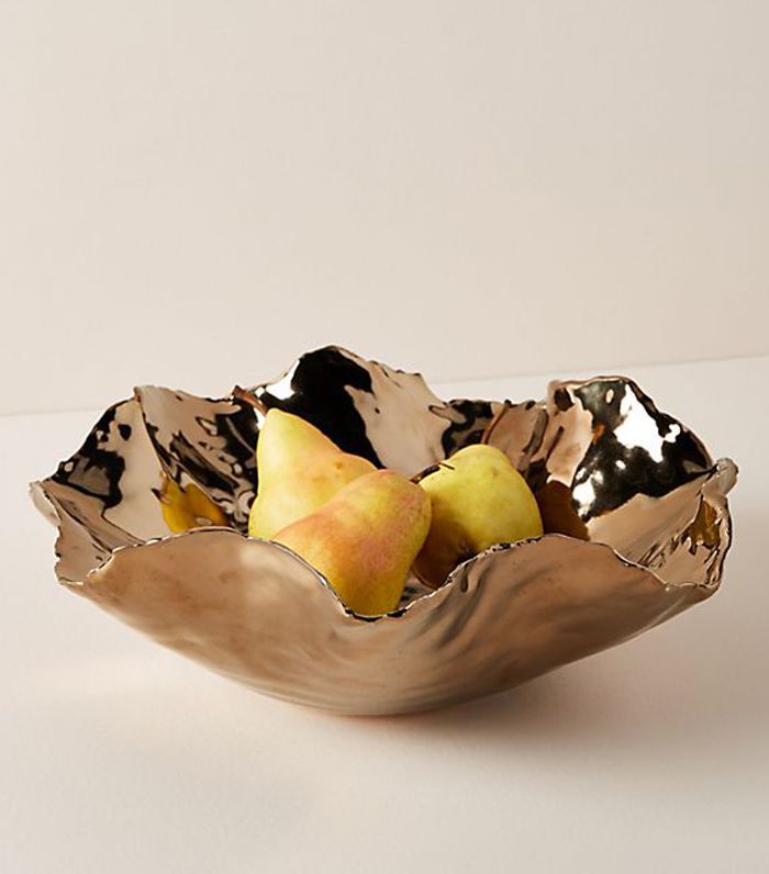 在这个雕塑般的铜碗里装满石榴,这是一个低举起,低成本的季节性的中心装饰品。