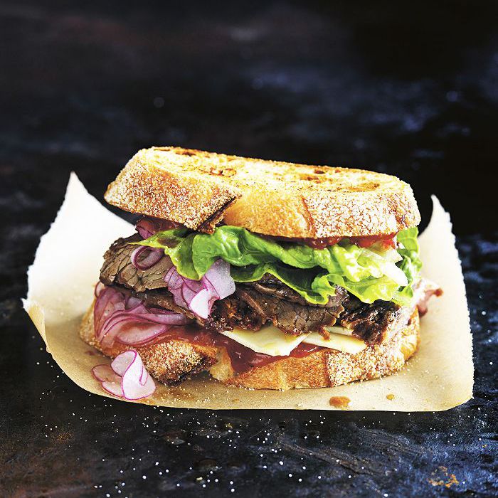 3.扩散的酸面团片,用加调料。与切达干酪,牛排,洋葱和莴苣切片的4强。三明治剩下的拓荒者服务。
