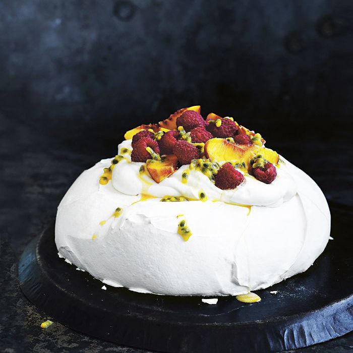 3.将蛋糕上的立场或板与顶配奶油,覆盆子,百香果和桃子帕夫洛娃服务。