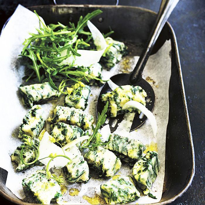 1.将意大利乳清干酪,巴马干酪,面粉,鸡蛋,盐和胡椒在一个大碗里。混合直到合并和粘性面团形式。