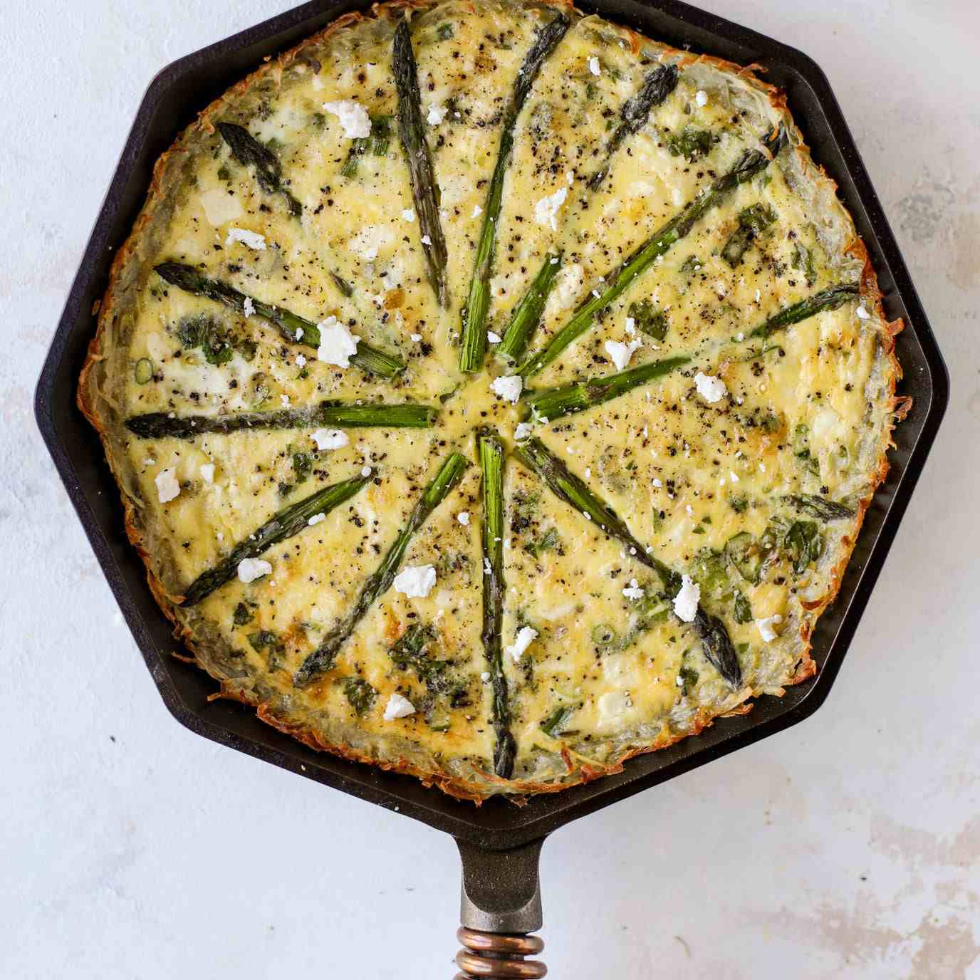 英雄成分:三个字:哈希棕色外壳。这是理想的脆,咸船只主机鸡蛋,芦笋和奶酪。