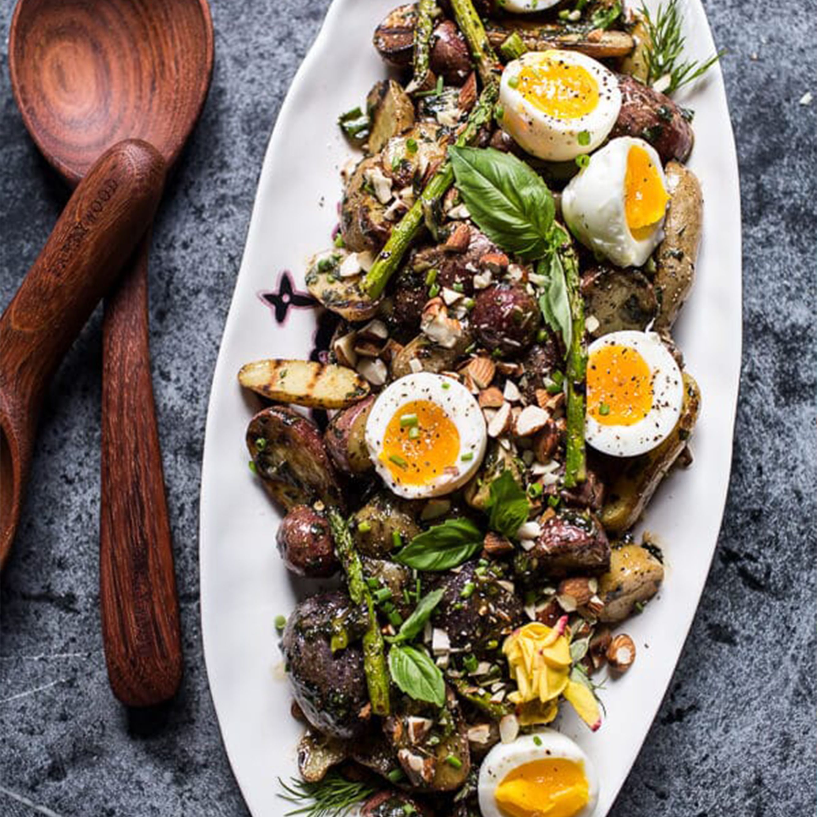 配方:烤土豆沙拉与罗勒杏仁和Chimichurri 7分钟的鸡蛋
