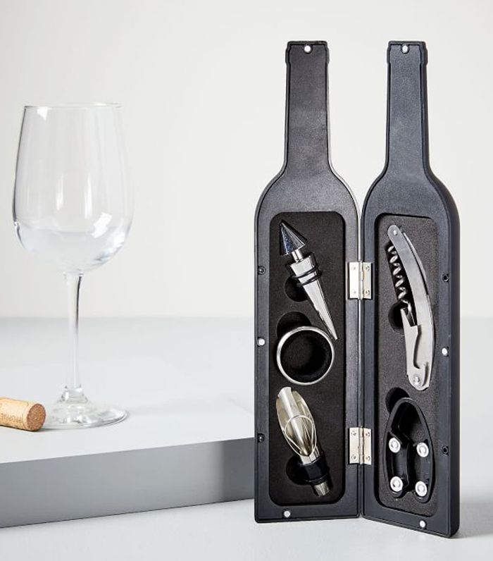 这个聪明的葡萄酒配件集所有你可以享受到的葡萄酒都储存在一个好玩的瓶状的情况下。