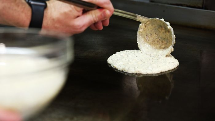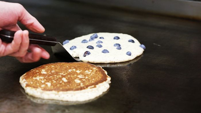 在热的煎锅上煎煎饼,或者在平底锅上涂上一层橄榄油。钢包¼杯面糊放到烤盘或平底锅。在面糊成型之前,在薄煎饼上撒上蓝莓。