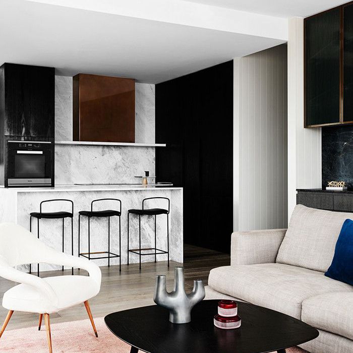 顿时涨得通红地毯展示了如何引进软,中性成熟的元素不牺牲空间的大胆,现代,阳刚的氛围。在戏剧性的,建筑黑色和白色的设计细节,在尘土飞扬的玫瑰地毯带来温暖和平易近人。