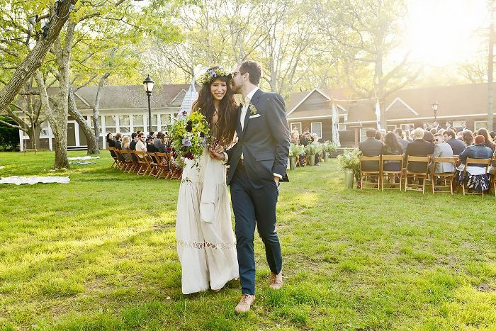 设计师帕米拉爱她注入自由奔放的奇思妙想变成她的珠宝,所以当然她的婚礼有一个类似的无忧无虑的氛围。爱情看上去像她真正的花卉冠和花束花园林地仙女。接待处发生在一个很轻松的环境,有折叠式木材椅子和一个绿树掩映。