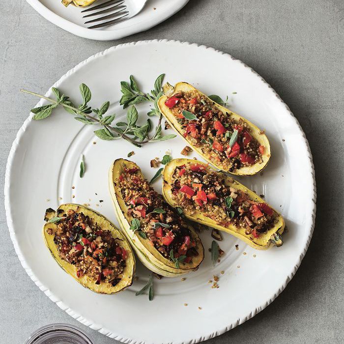 “我喜欢那些让人感觉很丰盛的素食,它们能让你忘记你不是在吃肉。这是其中一道菜。藜麦馅料,用山核桃和鼠尾草调味,让人想起感恩节大餐。熟食南瓜是藜麦馅料的最佳储藏地。它有一种甜美、浓郁的味道和肉质,再加上它的皮很嫩,足以让整个容器都可以食用。”