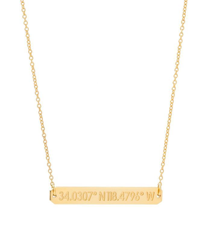 她已经有戒指了,但你还可以送她一条精致的项链。向她的家乡致敬,或在她举行婚礼的确切地点,用这条金条项链雕刻你选择的坐标。这是一件有意义的日常纪念品,可以添加到她的珠宝收藏中。