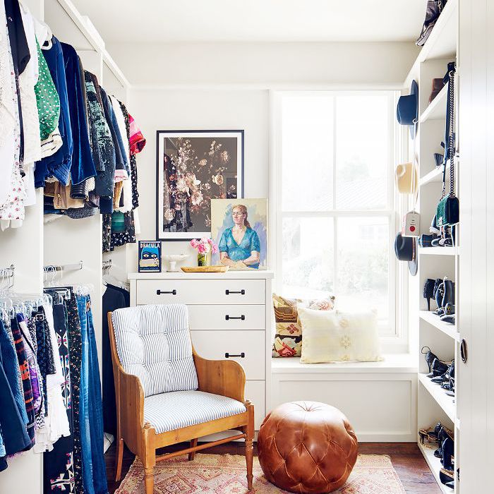 我们都梦想有一个像德克尔那样大的步入式衣帽间。即使你的梳妆区空间有限,也可以用旧地毯和皮革坐垫来装饰一下。