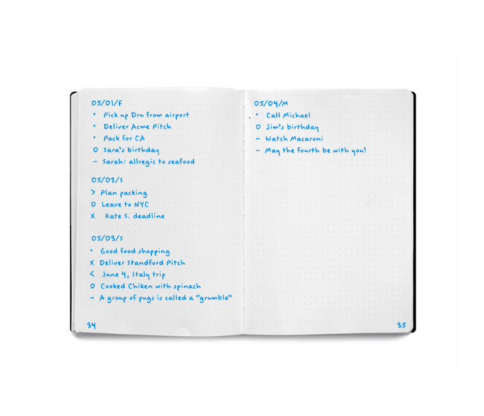现在是时候让你的待办事项清单变得有条理了。就像一个超级驱动的秘密社会,BuJo使用一系列符号来编码每个任务。常规作业以项目符号的形式输入到每日日志中,事件用“O”标记,一般注释在破折号后面。当你完成了一项任务,参加了一个活动,或者在一个便条上采取了行动,你就用一个叉把它划掉。