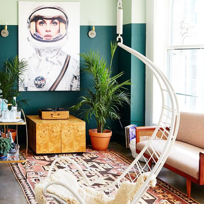 乍一看,人们不会猜测的空间的最具挑战性的细节是无害的悬浮古董椅子。“我认为它现在看起来相当不错,但张贴的是吊椅起来是一个beyotch!”笑年轻。