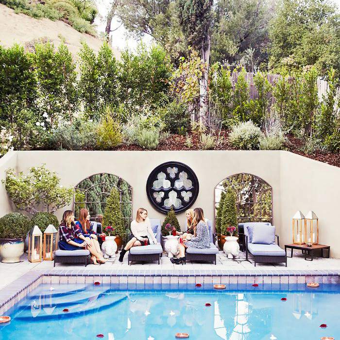 戴安娜·艾格伦的法式园林为主题的空间是浪漫迷人的无异。这位女演员告诉我们,“我知道我想要的色彩的故事是蓝色的,”一个安静的休息区,一个很好的选择由她池。为了实现她自己的院子里一看,只是围绕你的躺椅木灯笼和浮动votives现场设置。