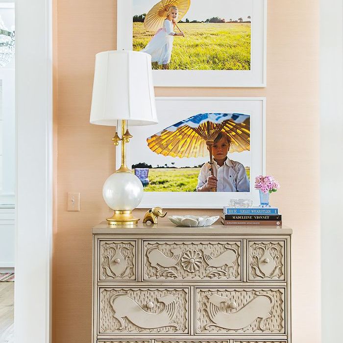 入口与外部保持一致,画着传统的家庭照片,配以山核桃木椅子上的雕花箱和柔软的粉色草布墙纸。只有前卫的摩洛哥boucherouite地毯暗示了未来的趋势。