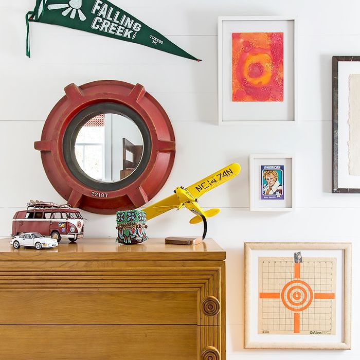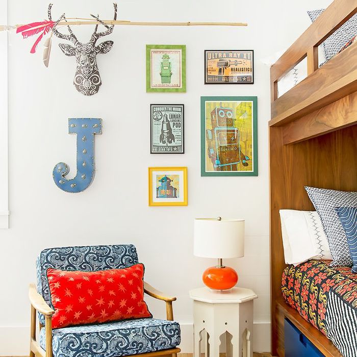 楼上的孩子的卧室,基南想要用生命、色彩和所有他们喜欢的东西来填充空间。在杰的房间里,这意味着许多明亮的蓝色和红色。