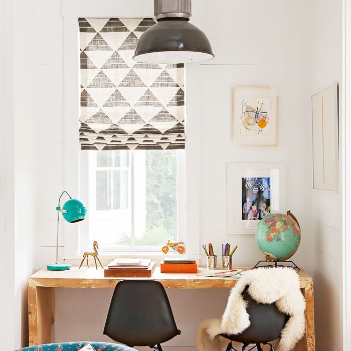 孩子们也有了自己的书房,在家庭娱乐室的一个角落里建了一个角落。校舍风格的物品是从eBay和当地的古董店购买的。