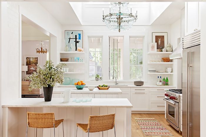 “我们的架构师博Clowney他非常善于找出让一个空间获得最佳光线的方法,”基南说。“我们白天不需要开灯,因为我们的灯很亮。”For the kitchen, this meant a stepped up ceiling finished with an ornate chandelier. A好开放的流对基南来说,客厅很重要,她喜欢家人在厨房做饭。