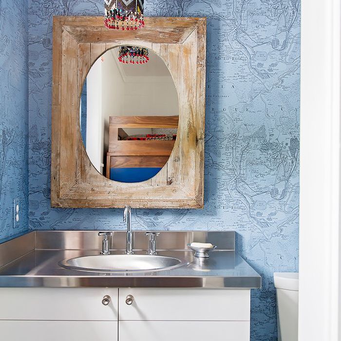 孩子们的盥洗室贴满了克里斯蒂安·拉克鲁瓦(Christian Lacroix)设计的世界地图墙纸、白色的赛百味瓷砖和男孩要求的不锈钢水槽。