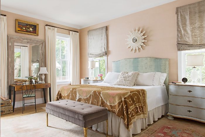 在主卧室,一种平静的氛围占据主导地位,远离充满活力的混乱的家庭生活。基南说:“我们的慕拉诺玻璃灯为主卧室更浪漫的感觉奠定了基调。”她选择了女性化的粉色草布墙纸,并使用柔和的色调来软化空间。