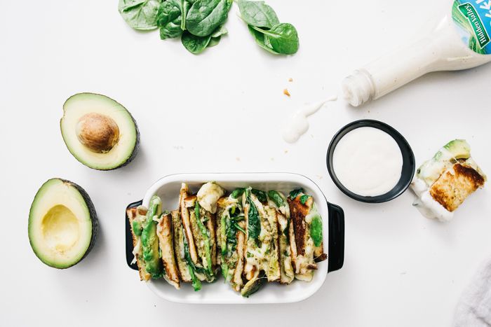 颓废因素:这种三明治是更升高比一般的烤奶酪。正如其名称所揭示的,绿色的烤奶酪充满香蒜酱,菠菜,鳄梨。To add even more of a twist to this classic sandwich, once your grilled cheese is perfectly melty and toasted, remove it from the pan, slice it into rectangular strips, and try dipping it in whatever kind of dressing you’re in the mood for.