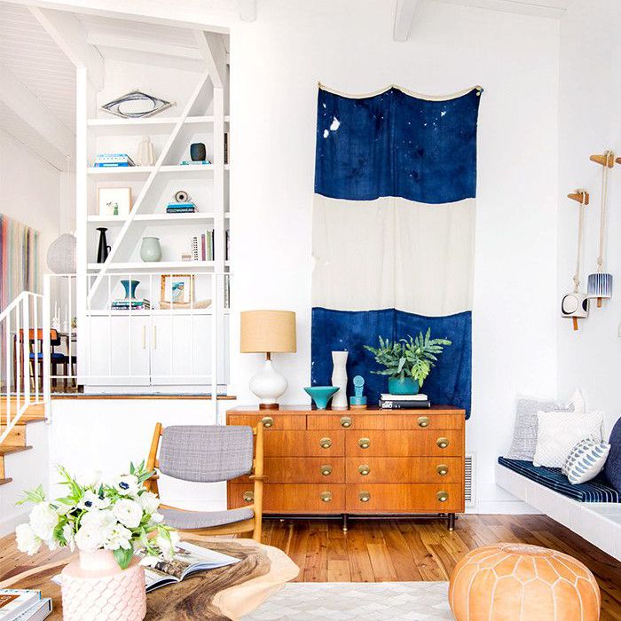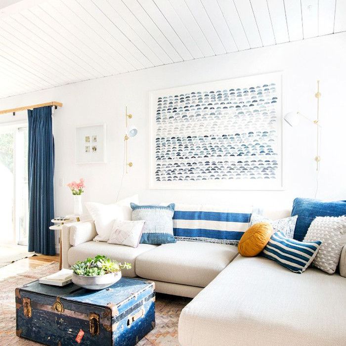 蓝色和白色共同构成了在卡利酷客厅与航海影响的经典组合。在很多质地的枕头,靛蓝的艺术品,一个深蓝色的复古行李箱作为一个茶几的投掷给这个空间的极致休闲沿海的吸引力。
