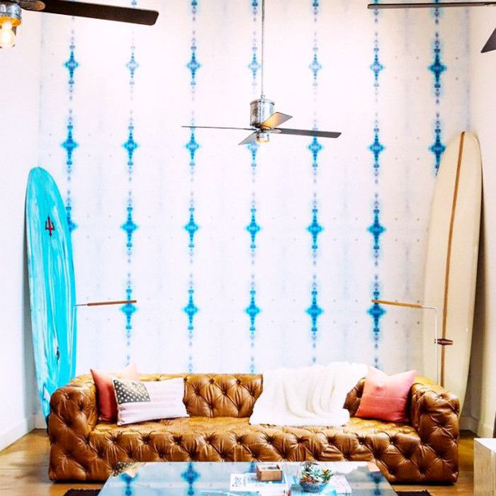 对于沿海灵感,真正使飞溅,在扎染效果水产壁纸给这个房间水洗色的海洋喷雾。绿松石持久性有机污染物在整个空间中创建一个无尽的夏日氛围那年代由冲浪板在角落休息增强。
