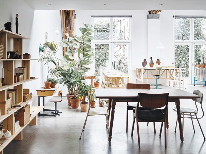 在阿姆斯特丹,一室公寓,两位设计师,西蒙娜Farresin和Andrea Trimarchi,混合抛光混凝土地面,未经处理的木材,和鲜明的白色墙壁的结合,创造了理想的背景为日益增长的植物采集。原始的环境有助于空间的室内室外的感觉,这是由大型落地式玻璃窗强调。