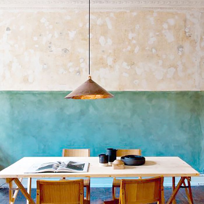 未经处理的原始的木地板和墙壁在丹麦设计师尼尔斯海峡的哥本哈根公寓创建铜绿Ø揭掉Christophersen。在他的家乡剥开壁纸层后,他决定离开他的壁上不变通过几十年的油漆和墙纸饰面创建的标记和缺陷。在他的餐厅,他混合patinaed墙与墙的下半部磨砂石膏绿松石效果。