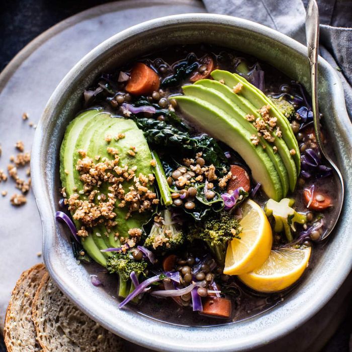 为什么工作原理:这汤是你能喝到的最健康的汤了。它富含营养丰富的蔬菜,如羽衣甘蓝、花椰菜、卷心菜、胡萝卜和韭菜,加上富含蛋白质的扁豆和像大蒜、姜和辣椒这样的排毒香料,这将帮助你“抵御冬季感冒,加快你的新陈代谢,”写食谱创造者Tieghan Gerard。