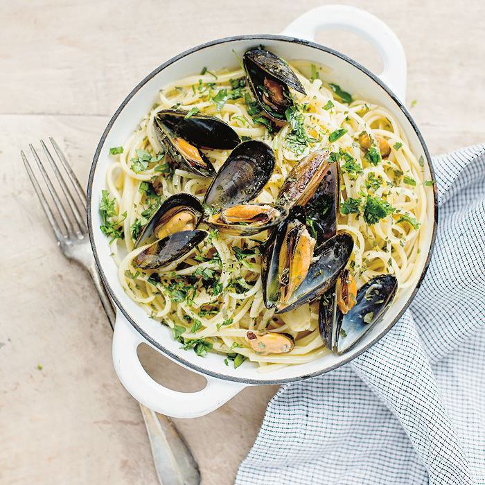 拆下热油锅,并丢弃在烹饪过程中没有打开任何贻贝。加入香菜和黄油烹调液体和拂通过。检查调味,加入盐,如果需要,现磨黑胡椒。倒入汁蒸煮过贻贝,添加面食,折腾结合。即可食用。