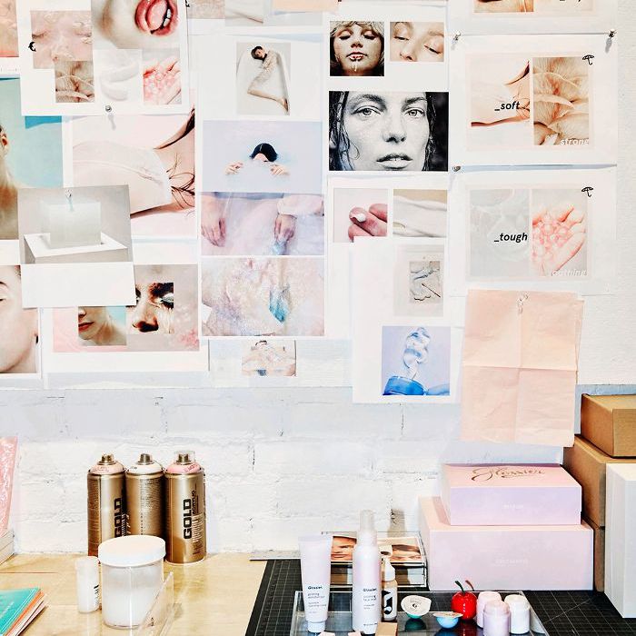艾米丽·维斯:我们是一家真正由情绪板驱动的公司。最初的Glossier真的是从我公寓里的这个情绪板诞生的,我收集了很多年的图像。每次我们推出一款新产品,我们就会围绕该产品创造出一个全新的世界。我们创建了一个情绪板在我们开始工作的最初阶段当我们开始做一个产品的时候,我们要真正思考这个女孩是谁,不同的纹理是什么,这个世界,是关于冰岛的水,还是关于图伦的海滩?所以,我们一直在做情绪板。我们想成为一个真正的合作公司,我们非常注重视觉,我们热爱摄影。我们出生在一个编辑网站,的光泽这里的每个人都从建造开放的创意空间中获得灵感。这就是为什么我们有一整面墙,我们可以拉起一张凳子坐下,做所有的事情,从包装设计到广告活动的布局设计,甚至是我们在这里做的拍摄。我们这里有一个很好的公共空间,有沙发,所以每个人都可以来玩。这方面的设计背后的思维正在为公司许多创造性的空间成为可能。
