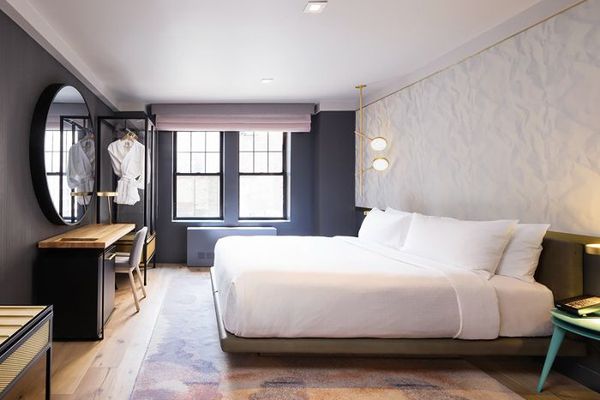 Fetherstone的愿景客房是一个明亮,通风,清洁的空间,她肯定完成。黑色和白色的房间设有从露露&格鲁吉亚亚麻平台床,并配有圆镜,嫁祸照片一张大理石桌子。“我总是喜欢把裁缝bedscape给我的客人,所以我放一套更男性化的枕头床单的壁橱里的男嘉宾得心应手,”她补充道。