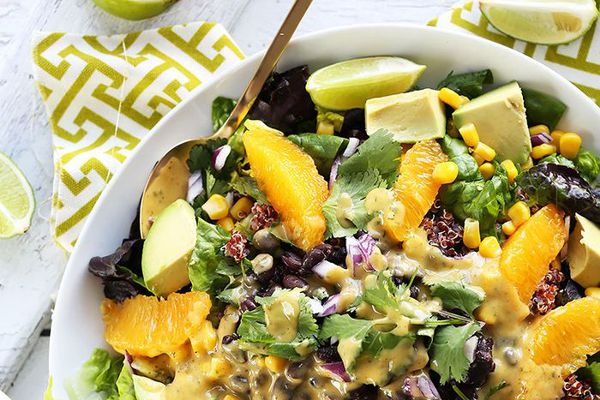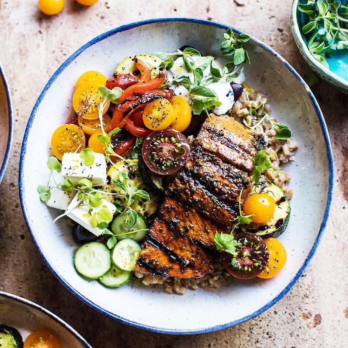 从这些鲑鱼索瓦兰吉碗半烤收获是理想的避暑餐。烤三文鱼坐在FARRO为一个额外的满足踢和松脆的对比床的顶部。健康,清爽成分盒装,它是完美的平日餐,因为它仅需要30分钟掀起。