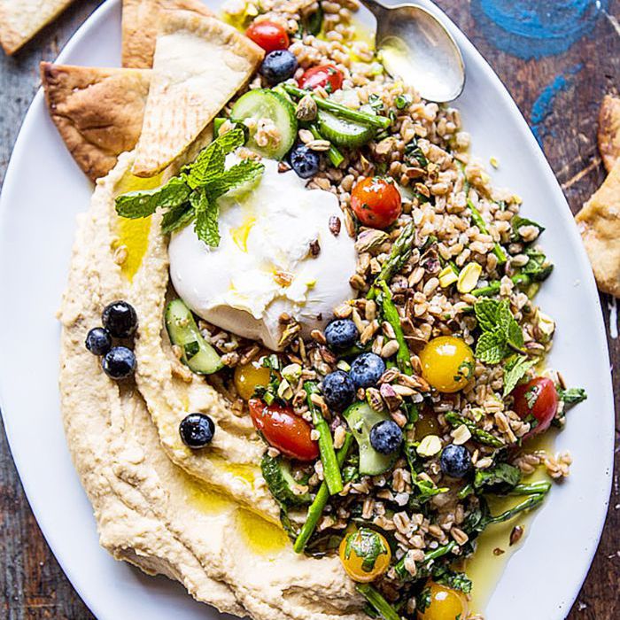 鹰嘴豆泥,burrata和FARRO塔布勒沙拉的这种传播从半烤收获是完美的入门如果您是举办派对。或为一个成熟的晚餐,享受这风味小吃拼盘全部由自己。