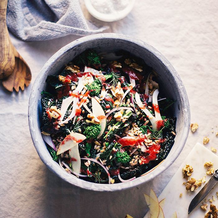 这花椰菜拉贝,羽衣甘蓝,以及FARRO收获沙拉第一混乱是健康和灌装碗只是耐人寻味的味道和质地的各适量。该FARRO轮出的菜推出一款质地较软的同时,也使其稍微填充,让您满意整天,完美脆脆/耐嚼的平衡,如果你愿意。