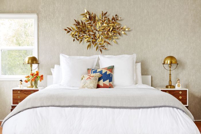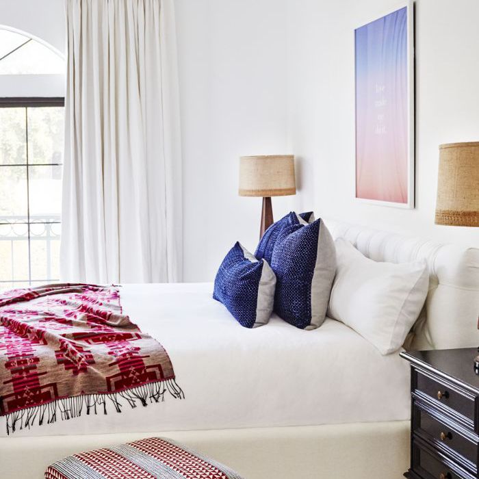 这个幸福的卧室是喜剧作家艾琳·福斯特享受最甜蜜的梦境的地方。虽然粉底是中性的,但它绝不是平淡无奇的,这要归功于印刷艺术品、抱枕和印花毯子带来的流行色彩。简单是关键。