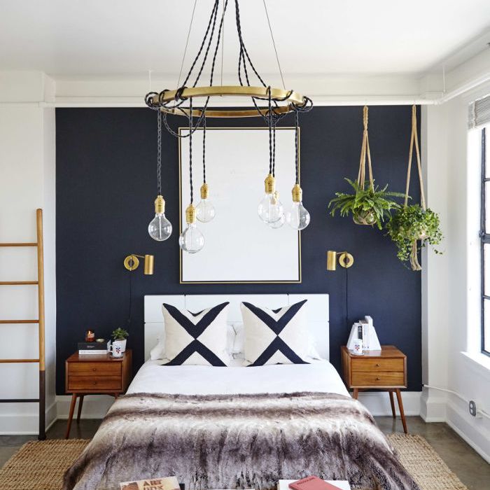 这间卧室的每一个部分都是迷人的,因为它是冒险的。将所有这些元素组合在一起(理论上)不应该奏效,但这绝对是一个令人惊奇的组合。那闪闪发光的灯具和挂着的装饰物植物感觉完美的女孩子气,而深蓝色的强调墙和毛皮扔增加了一点摇滚的边缘。