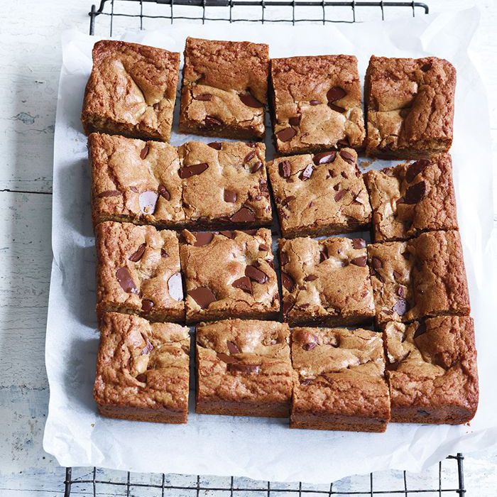 将面糊舀入备好的烤盘,撒上剩余的巧克力片和马尔东海盐,然后放入烤箱。烤30分钟。顶部应为金黄色,轻轻摇晃时仍有轻微的抖动。
