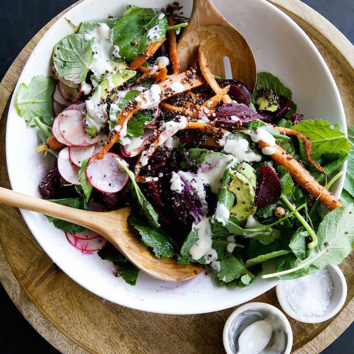根茎类蔬菜和藜沙拉配芝麻酱枫叶香醋