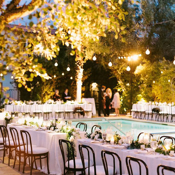 长面包表框的殖民地棕榈酒店游泳池,那里的鸡尾酒酒会和晚宴举行。鉴于户外设置,科尔说,她意识到照明。“我知道我们有一组照片疯狂的朋友,因此照明肯定是我们考虑了不少,”她说。“我们想要的东西令人难以置信的奉承和看起来很美也和贝丝想出了拉丝表上面水晶宝珠灯的想法,这是可爱的,优雅的更新,以典型的爱迪生灯泡。”