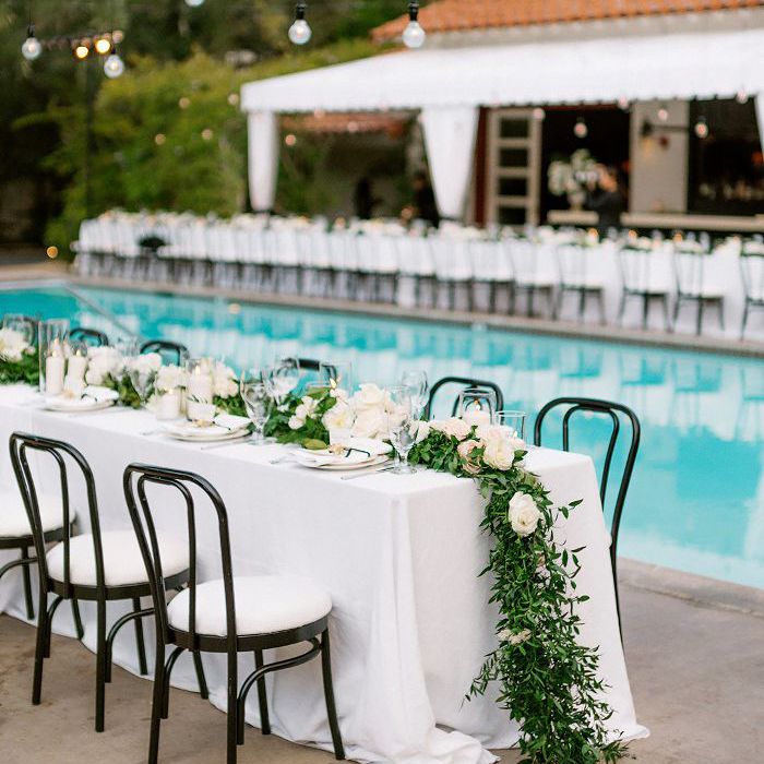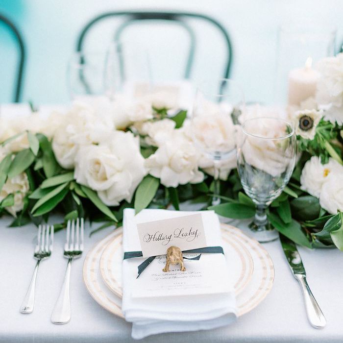 郁郁葱葱的花环形成了餐桌的中心,延续了活动的白色花卉主题。科尔说:“说到鲜花,我肯定来自一个鲜花越多的地方。”“因为我们在游泳池周围有这么长的桌子,我们喜欢把它们用鲜花包裹起来,花环和绿叶过多地撒在地上。”