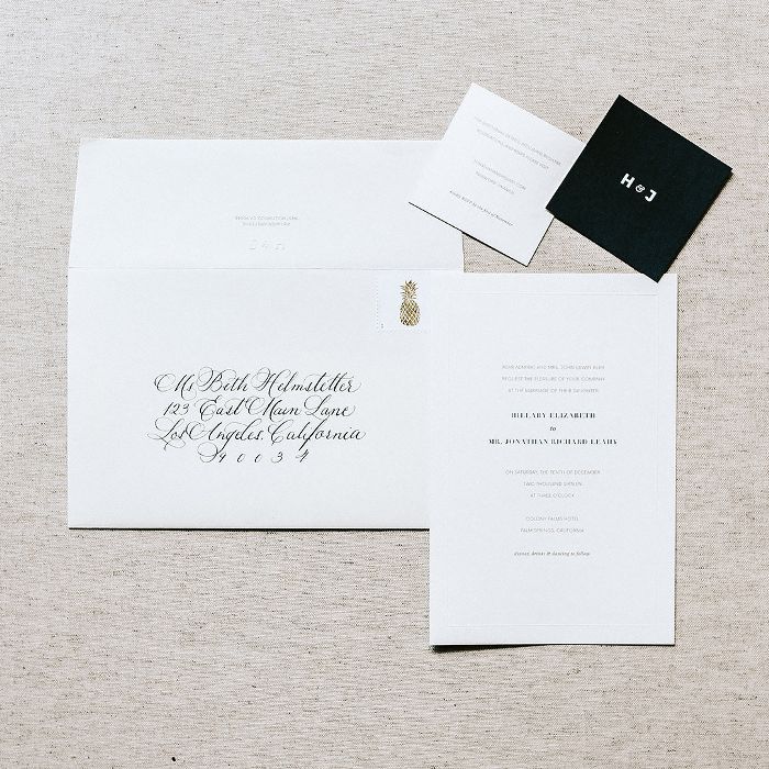 这个信封也有个人色彩。“我们选择了来自Zazzle的定制金箔菠萝邮票作为我们的邀请,这是对我们在考艾岛订婚并与之合作这一事实的认可卡特里娜书法所有书法婚礼,”科尔说。