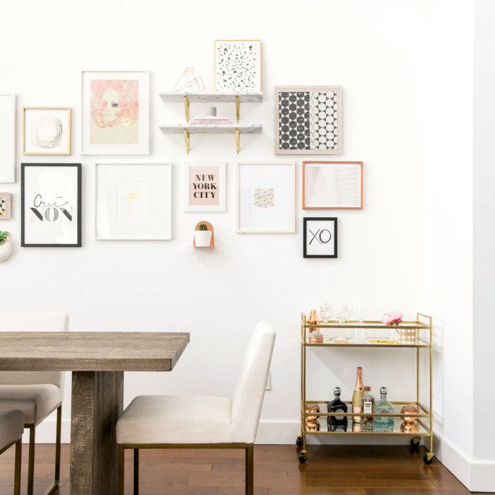 对优雅的餐椅和奢华的酒吧车质朴的再生木材表的对比,醒目正式与休闲之间的完美平衡。酒吧车也有很大的存储解决方案,特别是如果你需要节省空间。但是我们对这个区域在家里最喜欢的部分是在走廊的墙上,这是一项巨大的工程。实现类似的外观,关键是通过与不同类型的艺术和框架的工作,同时确保了颜色和款式的均匀分布和组织。